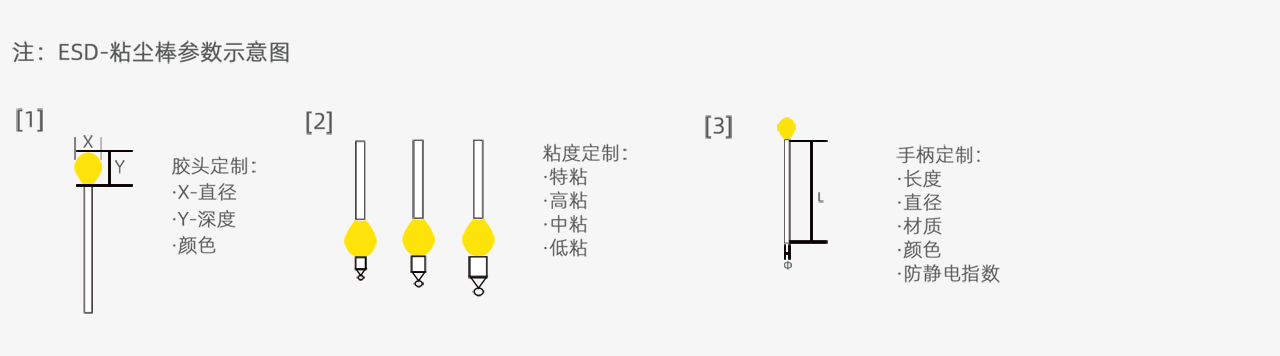 本公司產品技術參數及配置如有變更,恕不另行通知。 注: [1] 膠頭寬度的范圍,根據客戶實際使用環境定制; [2] 粘塵棒的總長度,在生產過程中會有±1.5mm公差。 |